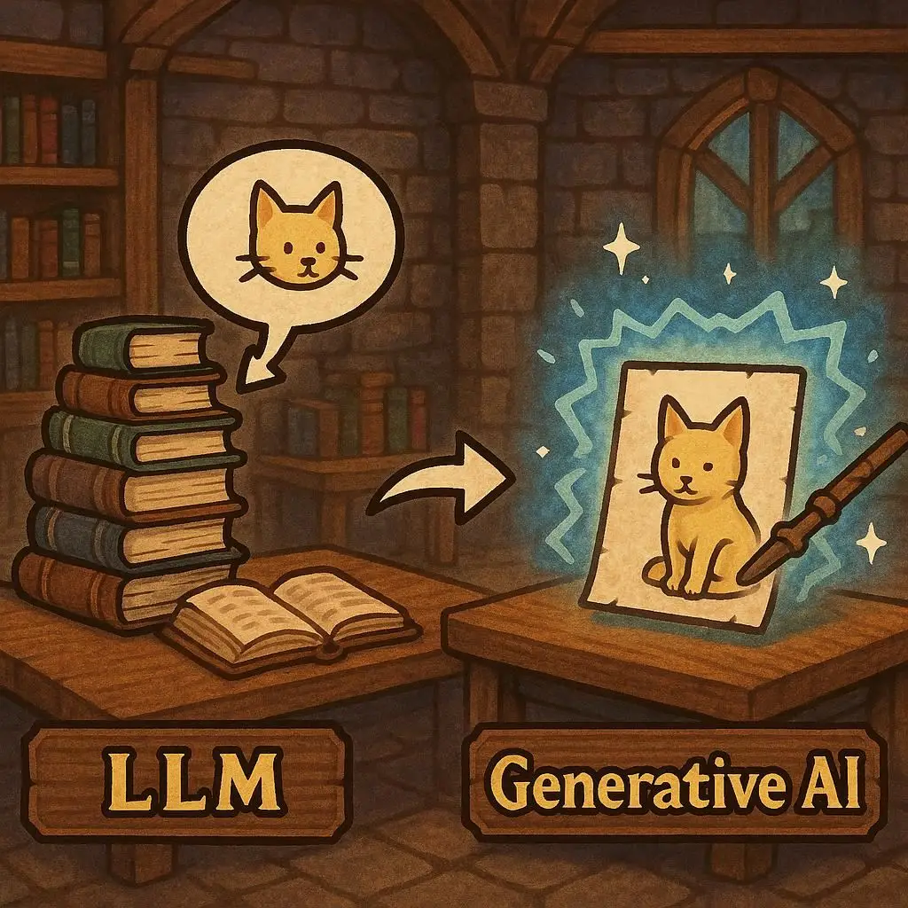 生成AIは、文字通り「コンテンツを生成するAI」の総称です。ここ数年で私たちの生活に浸透してきた、画像生成や動画作成などの技術もすべてこの中に含まれます。LLMが「言葉」を扱うのに対し、生成AIという枠組みはもっと広大な領域をカバーしているのです。