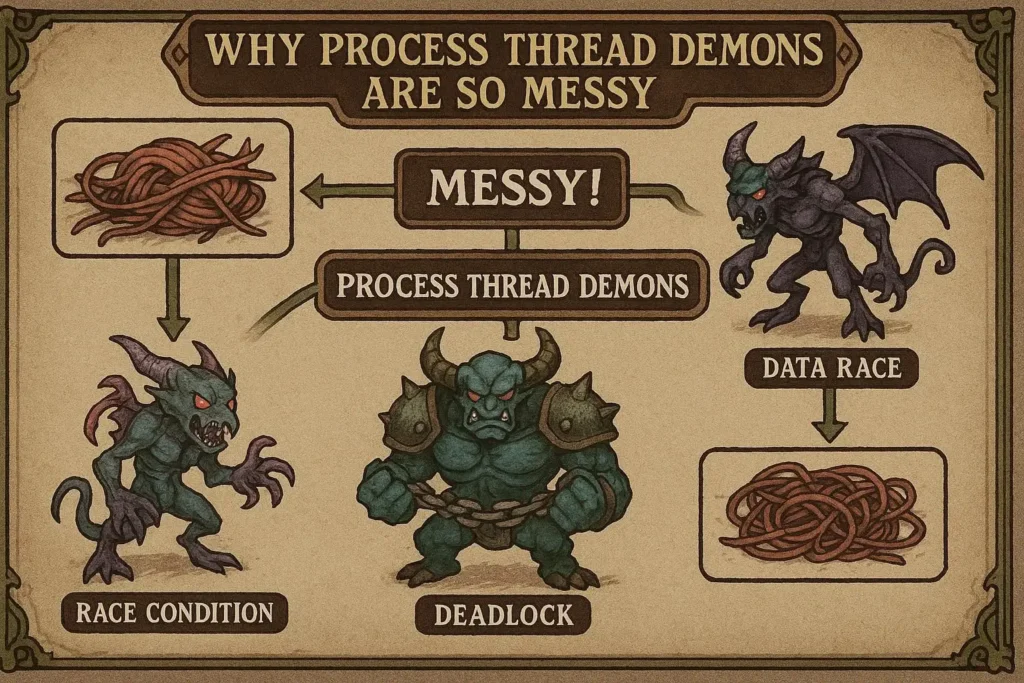 プログラムを実行したとき、画面の裏側で何かが動いている感覚は誰にでもあるはずです。しかし、その「動いている何か」を指す言葉が複数あるせいで、初心者は混乱の渦に突き落とされます。プロセスもスレッドも、そしてデーモンも、すべてが同じ「実行中のプログラム」に見えてしまうのが諸悪の根源です。