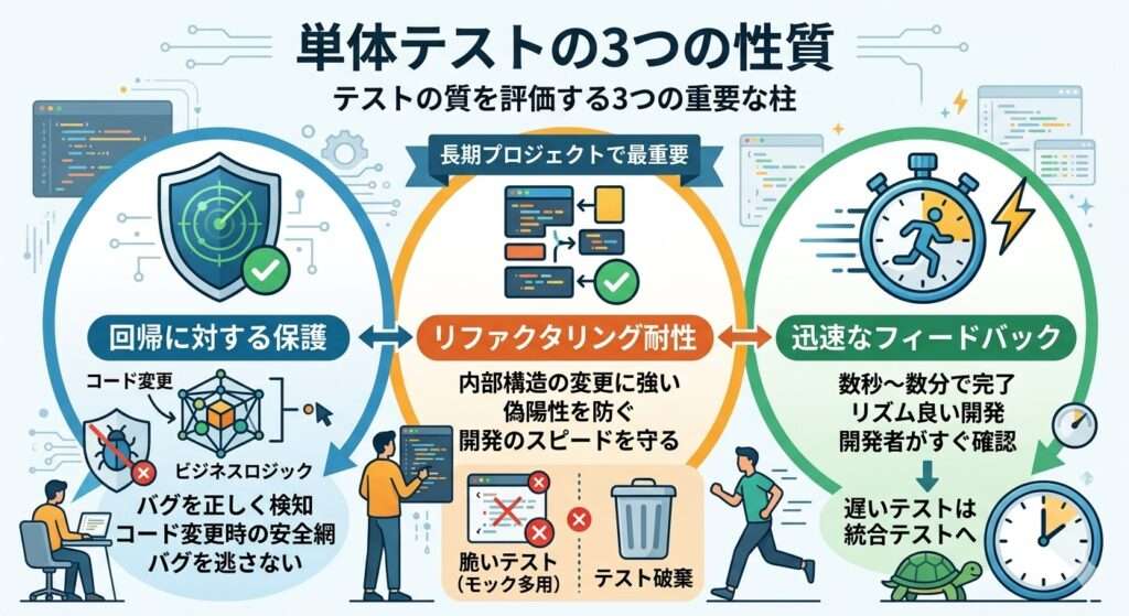 テストの質を評価するために、本書では4つの柱を提唱していますが、ここでは特に重要な3つの性質に絞って解説します。これらの基準を満たしているかを確認するだけで、無意味なテストを排除できます。