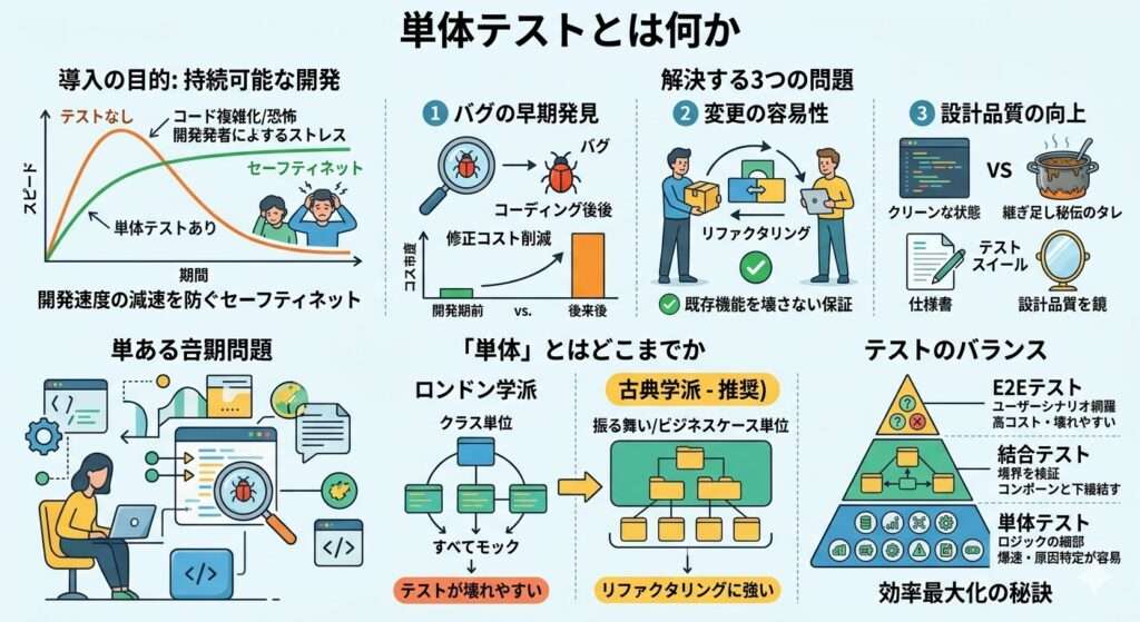 しかし、プロジェクトが成長しコードが複雑化するにつれて、既存機能への影響を恐れて開発速度は劇的に低下します。単体テストは、この「開発速度の減速」を食い止めるためのセーフティネットとして機能します。