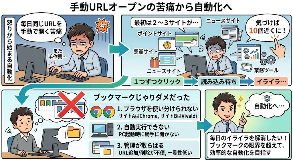 - 管理が散らばる:URLの追加や削除がブラウザのUI操作になるので、一覧性が低い