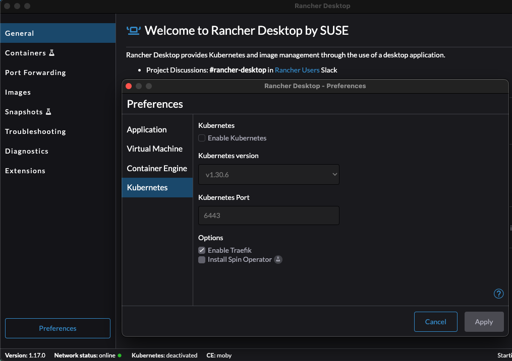 - Rancher DesktopをMacにインストールし、初期設定を完了できる